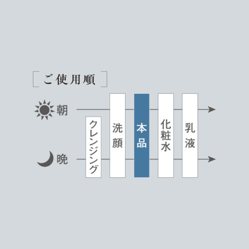 お肌を清潔にした後、化粧水のご使用前にお使いください。使用量はスポイトで4~5滴を手の平にとり、指先で軽くなじませます。その後、両手で両頬、鼻筋から顎、額へと順に両手で優しく包み込んでなじませます。気になる部分には適量を重ねてなじませてください。お手持ちのスキンケアと合わせてご使用いただけます。